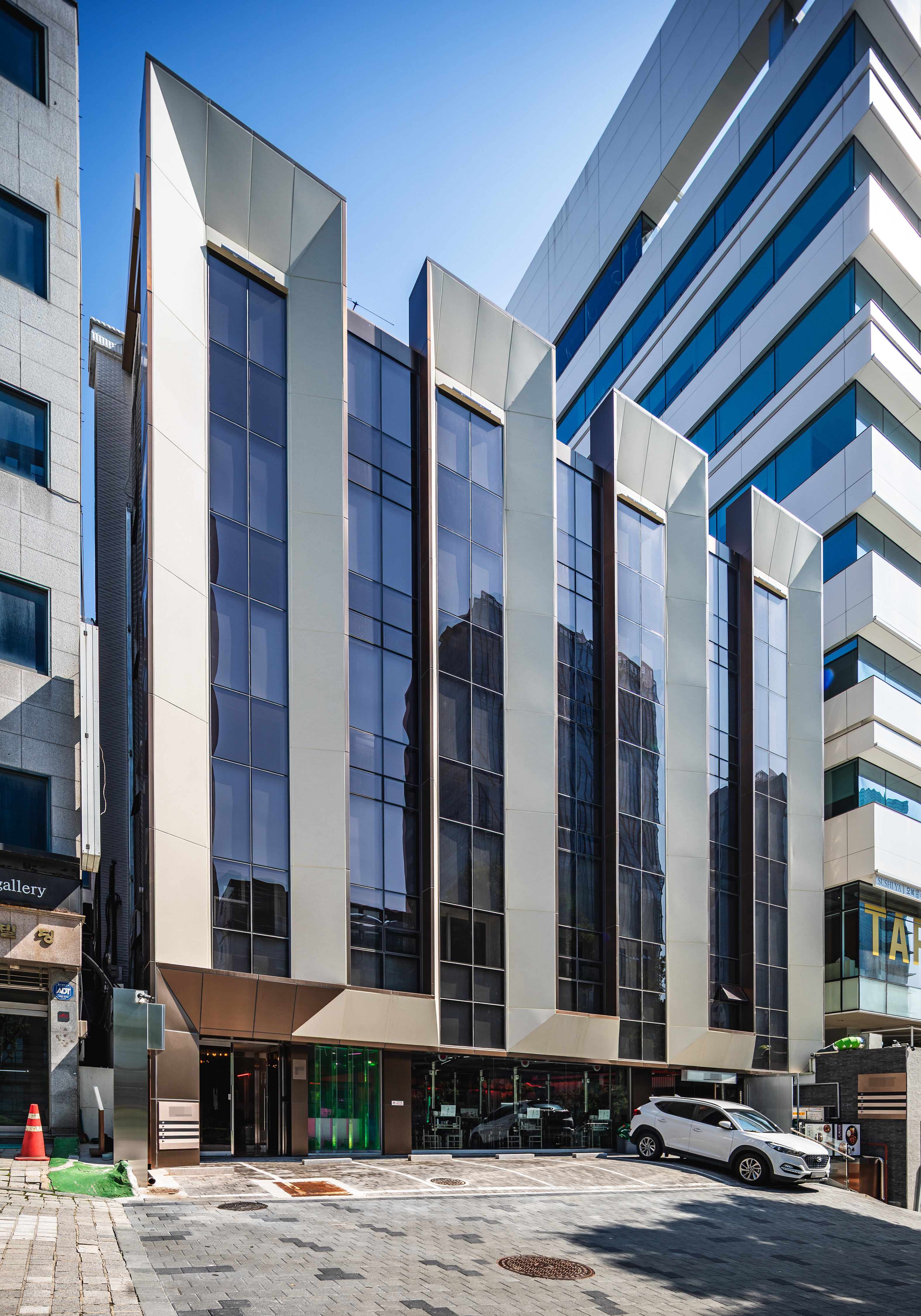 전면의 커튼월을 옥상까지 올려 건물이 더욱 웅장해